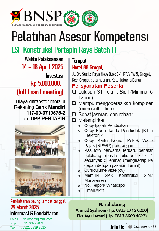 Daftarkan diri Anda untuk mengikuti Pelatihan Asesor Kompetensi LSP Konstruksi Pertapin Raya Batch III. Tahun 2025 Narahubung: Ahmad Syahroni (WA: 0813 1745 6200) Eka Ayu Lestari (WA: 0813 8669 4623)